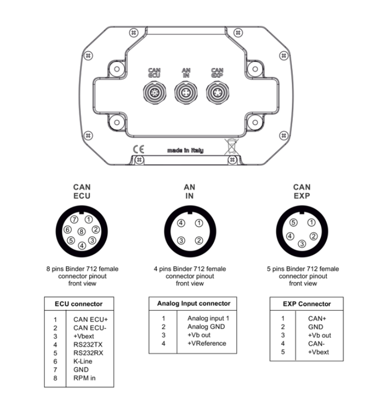 Le MXq collecte et enregistre les données provenant de multiples sources comme l'ECU, le GPS intégré, il possède une entrée analogique entièrement configurable et une entrée numérique (1 entrée de régime de bobine bas niveau, signal carré 0-5 V). Il ne possède pas de sorties numériques.